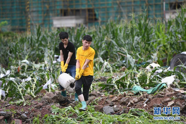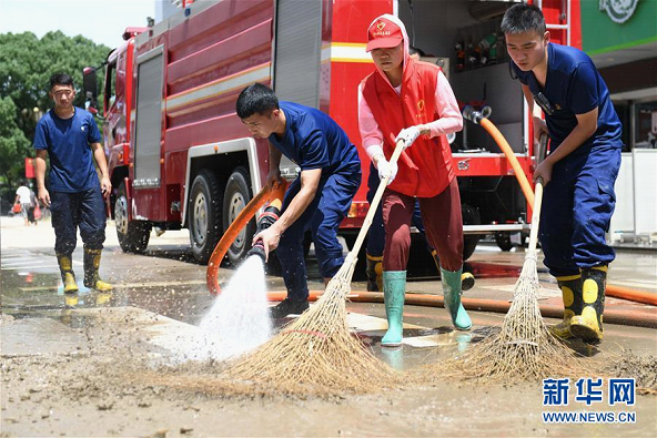 7月9日,安徽省歙縣消防人員和社區志愿者在災后清理路面。新華社記者張端攝