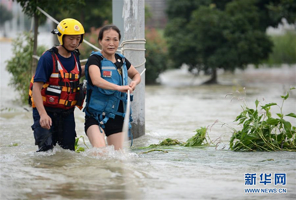7月20日,在安徽省六安市裕安區固鎮鎮,受災居民在救援人員的幫助下轉移。新華社記者韓曉雨攝