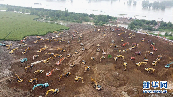 7月28日,在安徽省潁上縣姜唐湖蓄洪區戴家湖一處涵閘險情處置現場,人們操作機械設備搶筑臨時圩堤(無人機照片)。 新華社記者張端攝