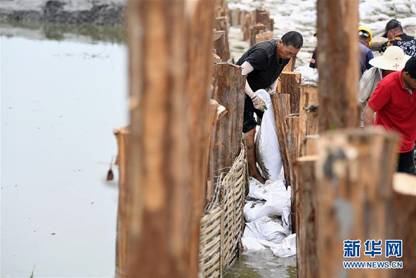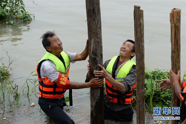 7月14日,安徽省樅陽縣長沙鄉村民在江水中搶堵圩堤管涌。新華社記者黃博涵攝