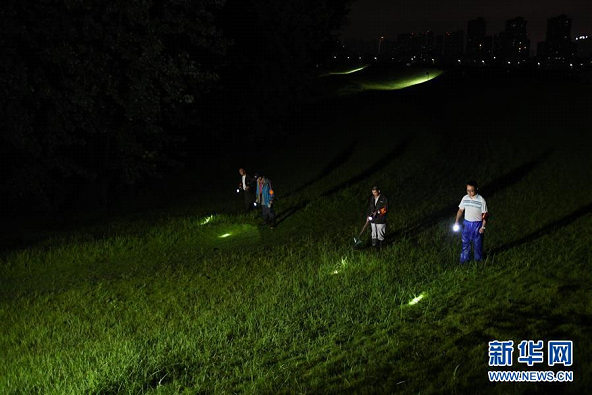 7月15日晚,安徽省蕪湖市弋江區馬塘街道防汛人員在青弋江大堤巡查。 新華社記者張端攝