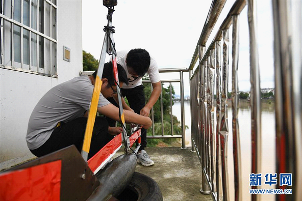 7月9日,在安徽省歙縣漁梁水文站,李佳(右)和同事在調試流速儀準備進行水文勘測。 新華社記者張端攝