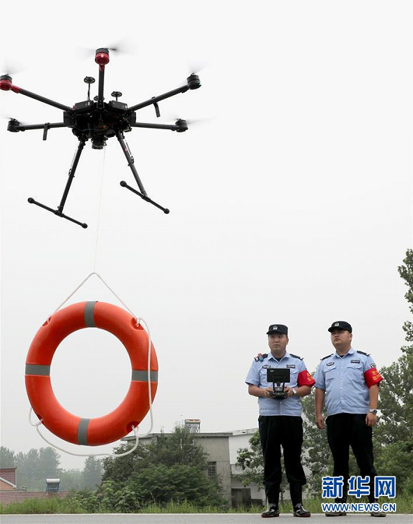 7月14日,在安徽無為長江大堤,來自合肥市肥東縣公安局巡警大隊的防汛人員使用無人機攜帶救生設備。 新華社發